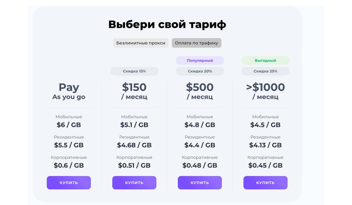В ассортименте три типа прокси: резидентные для обхода защит, мобильные для специфических платформ и загадочные «корпоративные» — скорее всего, это серверные или ISP прокси, но провайдер не уточняет. Интересный подход к тарификации — можно платить за трафик (от $0.6 за гигабайт) или купить пакет портов с безлимитом, но с лимитом в 500 одновременных подключений.