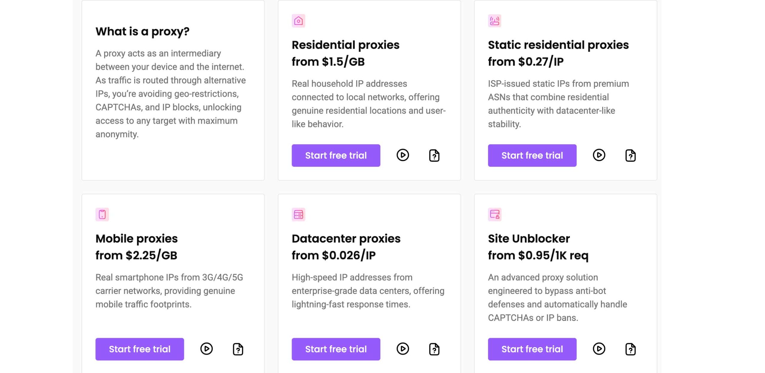 Классические прокси из дата-центров. Самый быстрый и дешевый тип, но с ограниченной анонимностью.
