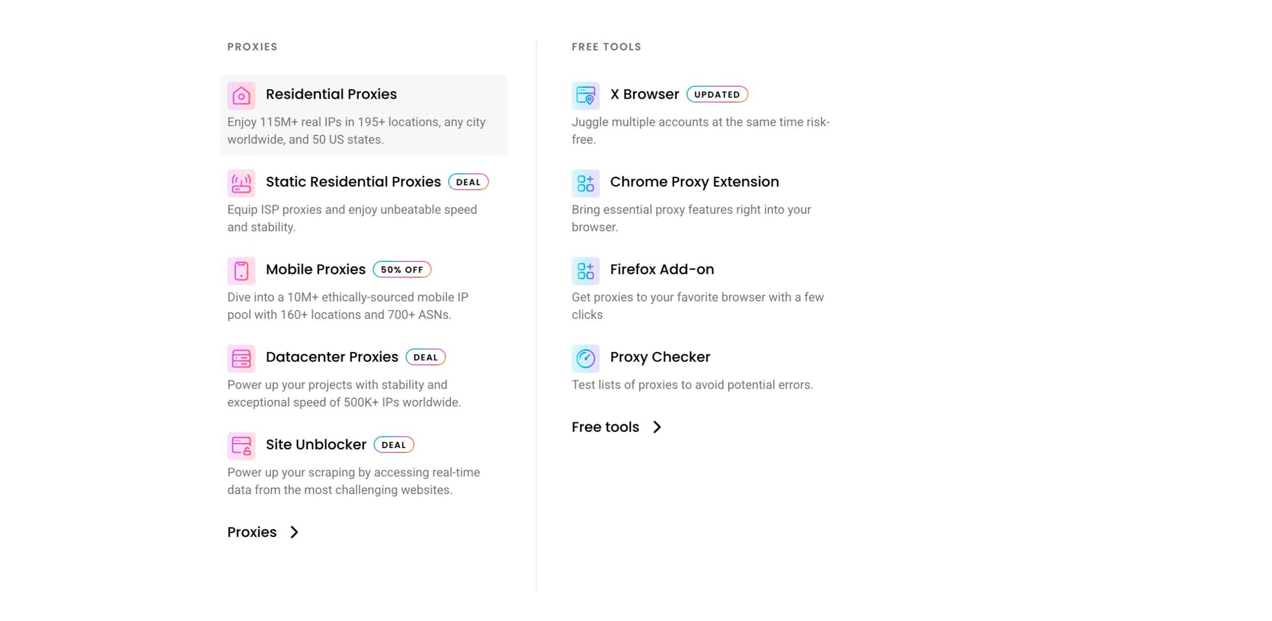Платформа ориентирована на самостоятельное использование (self-service) и предоставляет пользователям инструментарий для быстрой интеграции и масштабирования проектов. Основной фокус сервиса направлен на предоставление различных типов прокси: резидентских, мобильных, статических резидентских (ISP) и серверных.
