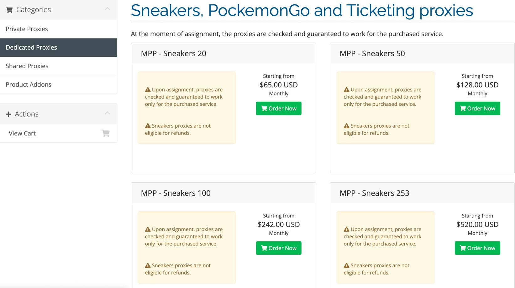 Сервис специализируется исключительно на datacenter прокси в трех категориях: приватные (индивидуальные IP для эксклюзивного использования), shared (3-5 пользователей делят IP) и специализированные. Последние — самое интересное: «Sneaker Proxies» оптимизированы для покупки лимитированных кроссовок на Nike, Adidas, Supreme, где скорость и чистота IP критичны. «Ticketing Proxies» настроены для Ticketmaster, AXS и других билетных платформ с агрессивными антибот-системами.