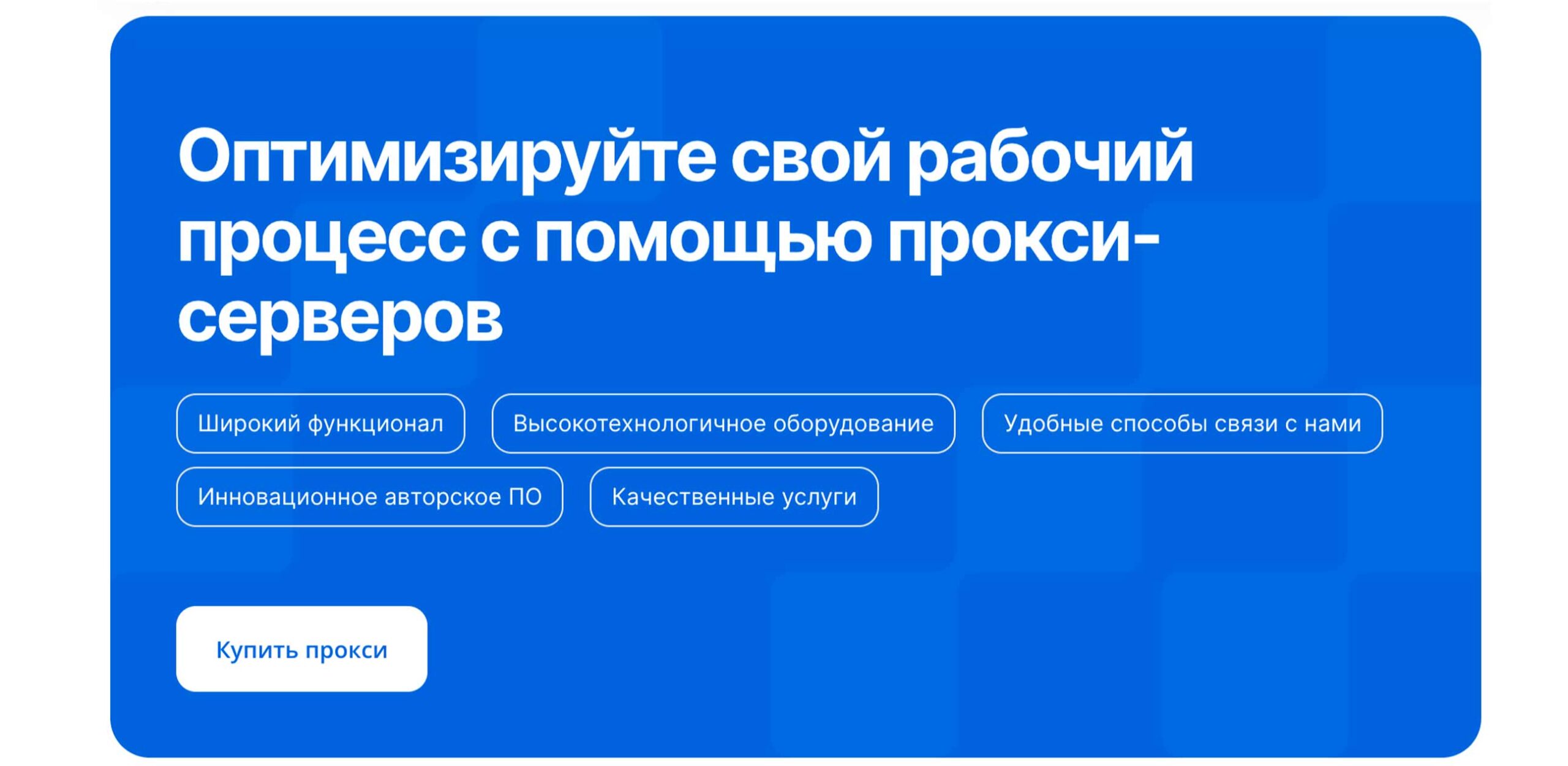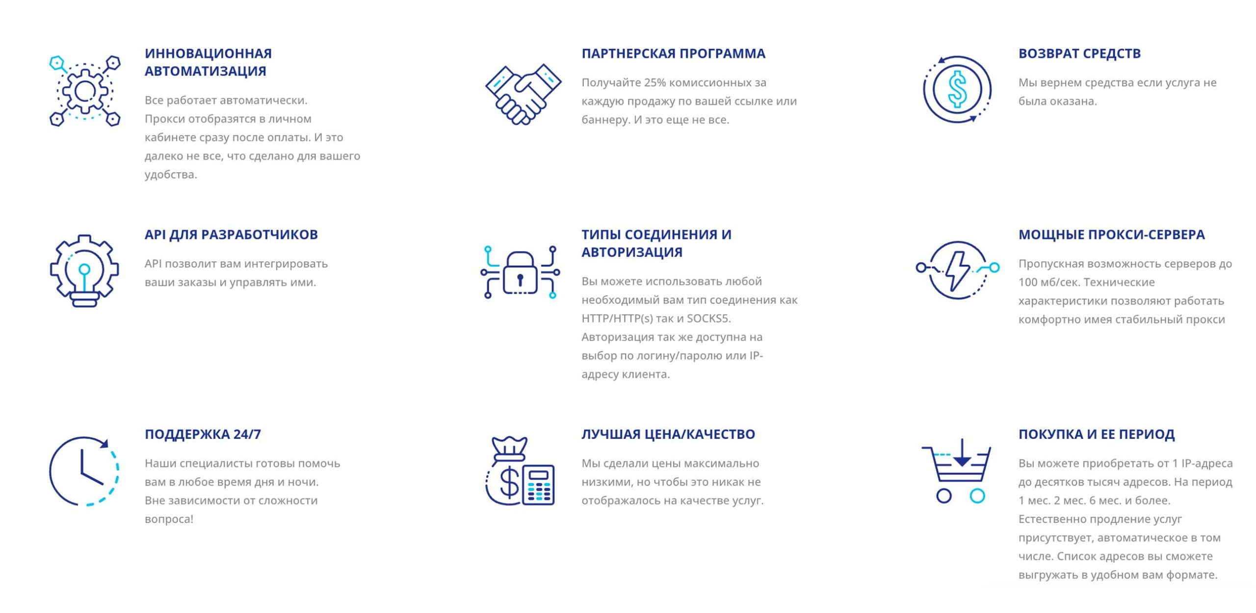 Техническая инфраструктура: каналы до 100 Мбит/с для серверных и до 30 Мбит/с для мобильных прокси. Акцент на стабильности работы.