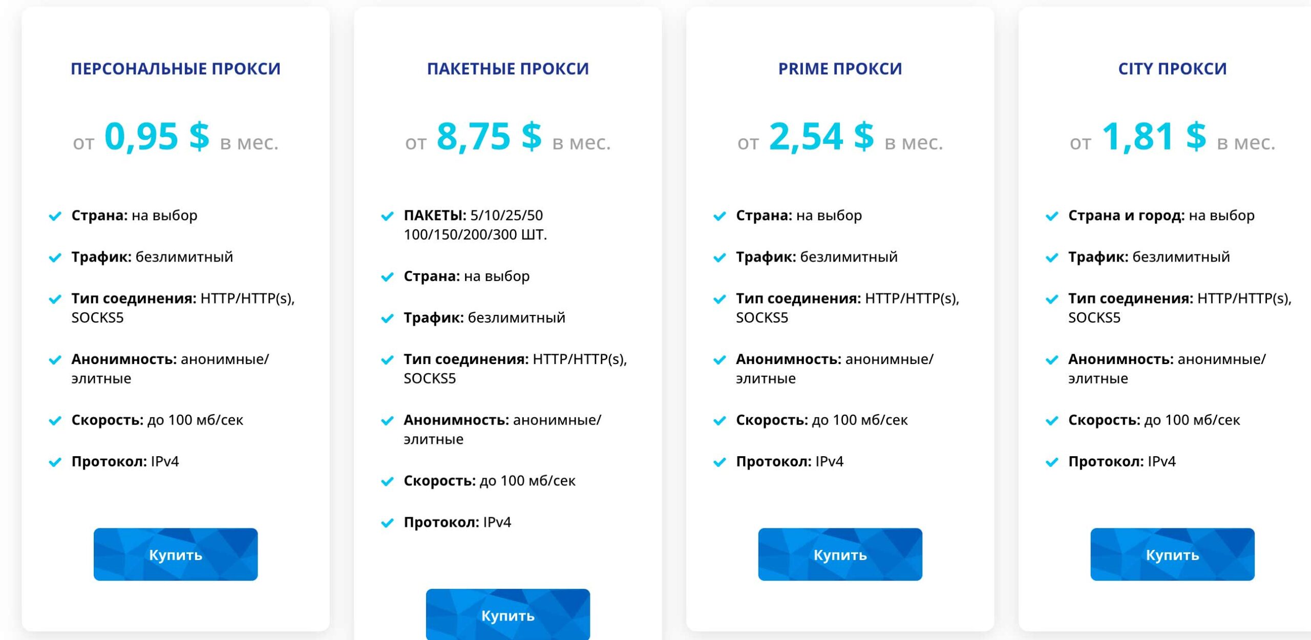 Основа продуктовой линейки — выделенные IPv4-адреса. «Персональные» прокси — классические dedicated datacenter IP в единоличное пользование, гарантирующие стабильную скорость. «Пакетные» прокси — наборы IP для параллельной работы (массовый парсинг, управление множеством аккаунтов), также без sharing между клиентами.