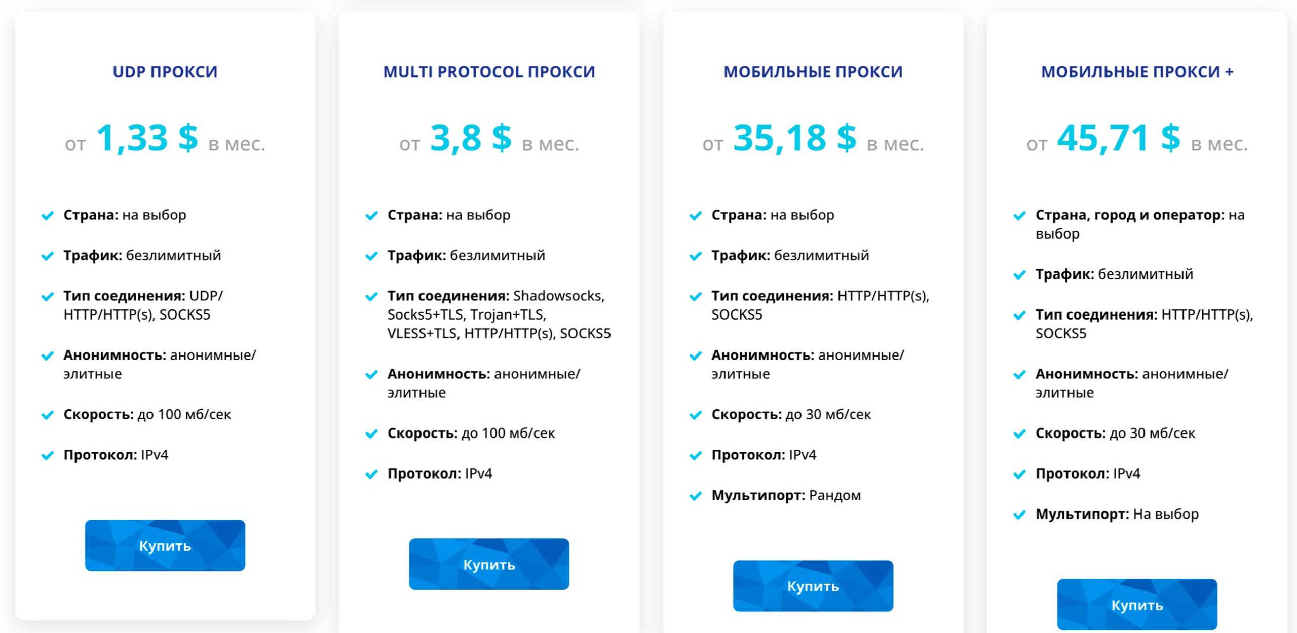 Главная сила сервиса — в его технической уникальности. UDP-прокси для игр, Multi-protocol с Shadowsocks для обхода цензуры, City-прокси с точным таргетингом — такого набора вы не найдете у большинства конкурентов. Добавьте сюда безлимитный трафик на всех тарифах и очень конкурентные цены, и получите привлекательное предложение для профессионалов.