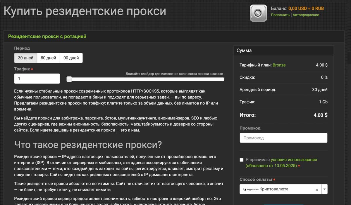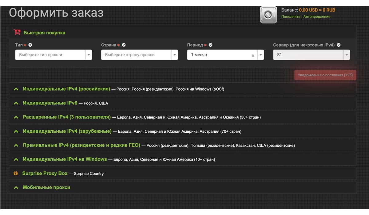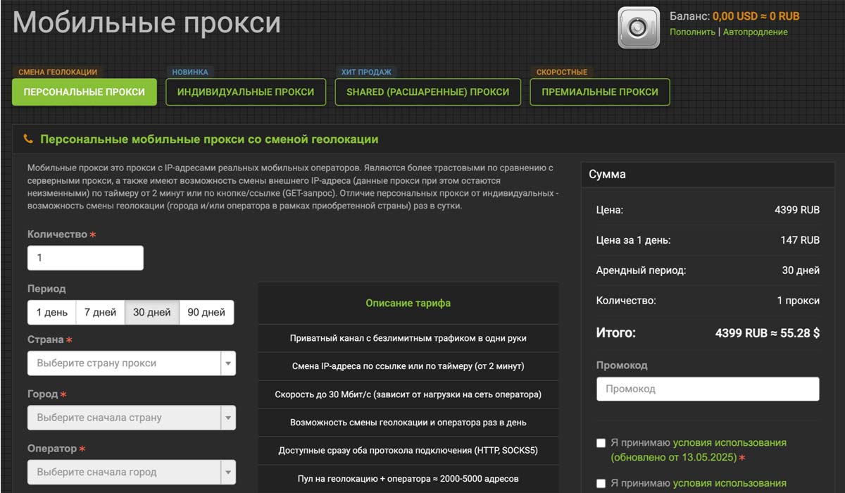 | Типы прокси | Индивидуальные/Shared IPv4, Индивидуальные/Динамические IPv6, Резидентские IPv4, Мобильные IPv4 (включая персональные со сменой ГЕО) |