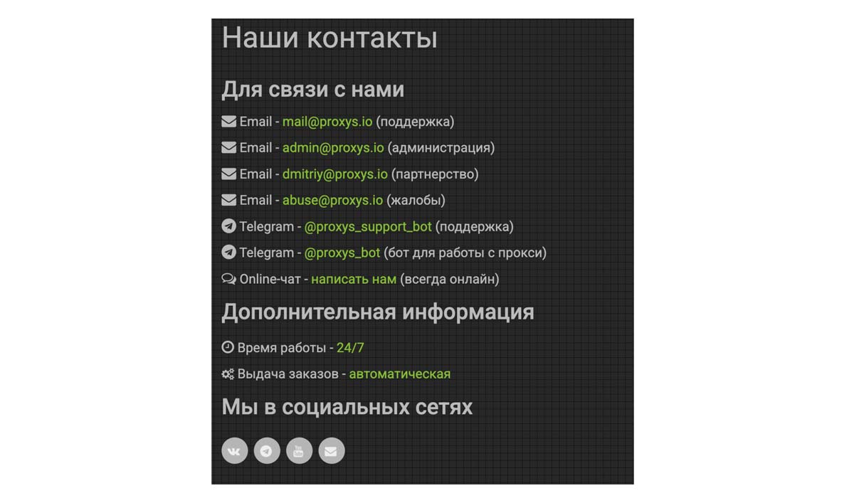 Технически всё стандартно: HTTP(S) и SOCKS5 работают одновременно, есть API для интеграции, собственное браузерное расширение ProxyControl, прокси-чекер для проверки. Поддержка круглосуточная через несколько каналов — Telegram, чат на сайте, тикеты. Скорость ответа заявлена в минутах, не часах.