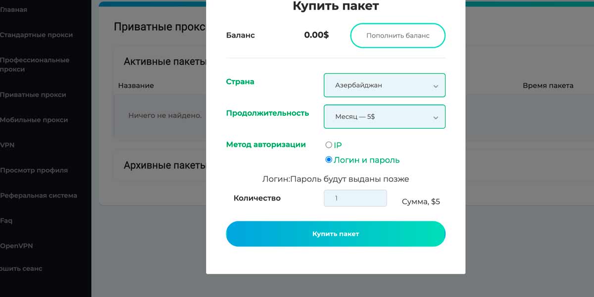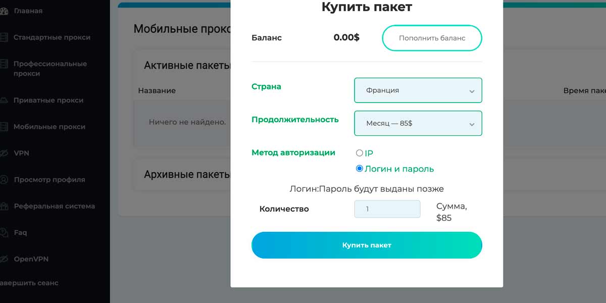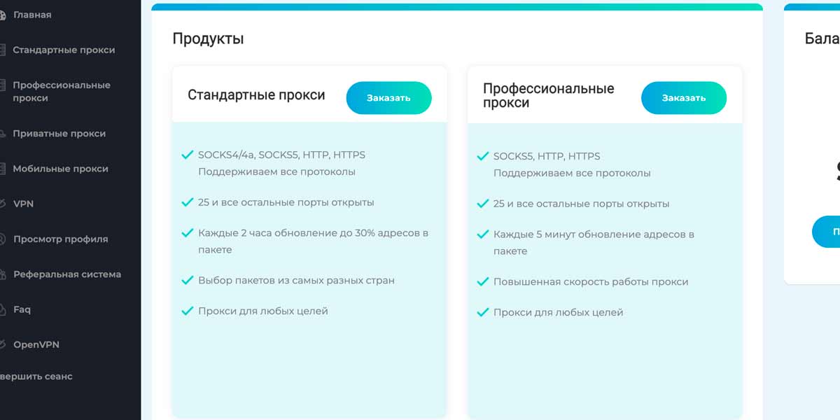 Основу составляют пакетные прокси с ротацией двух уровней: «Стандартные» и «Профессиональные». Это shared datacenter решения с общим пулом IP.